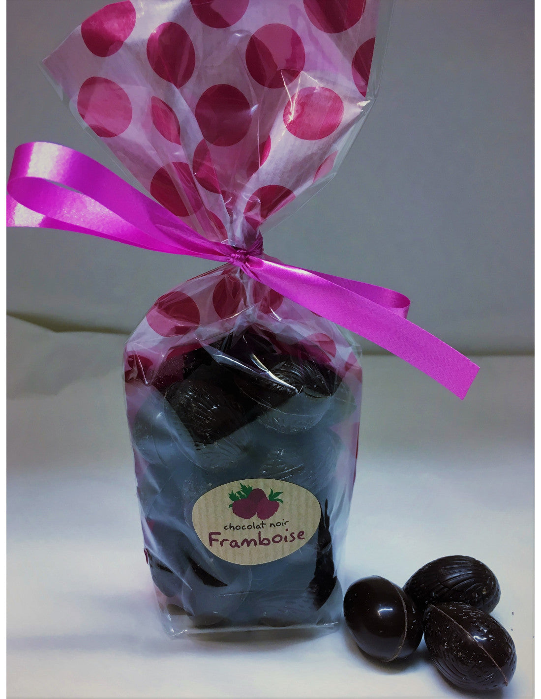 Ingrédients : Chocolat 100% bio, avec pâte de framboise maison. Pas de lactose, pas de lécithine, pas de vanille et pas de gluten