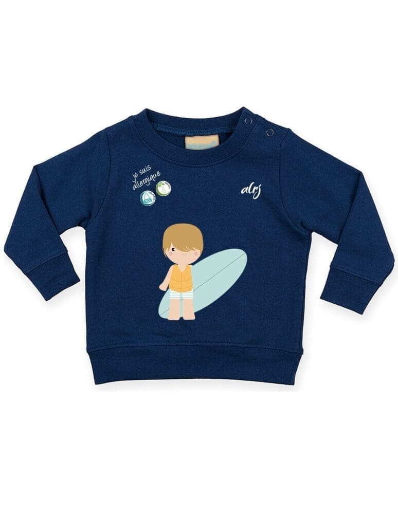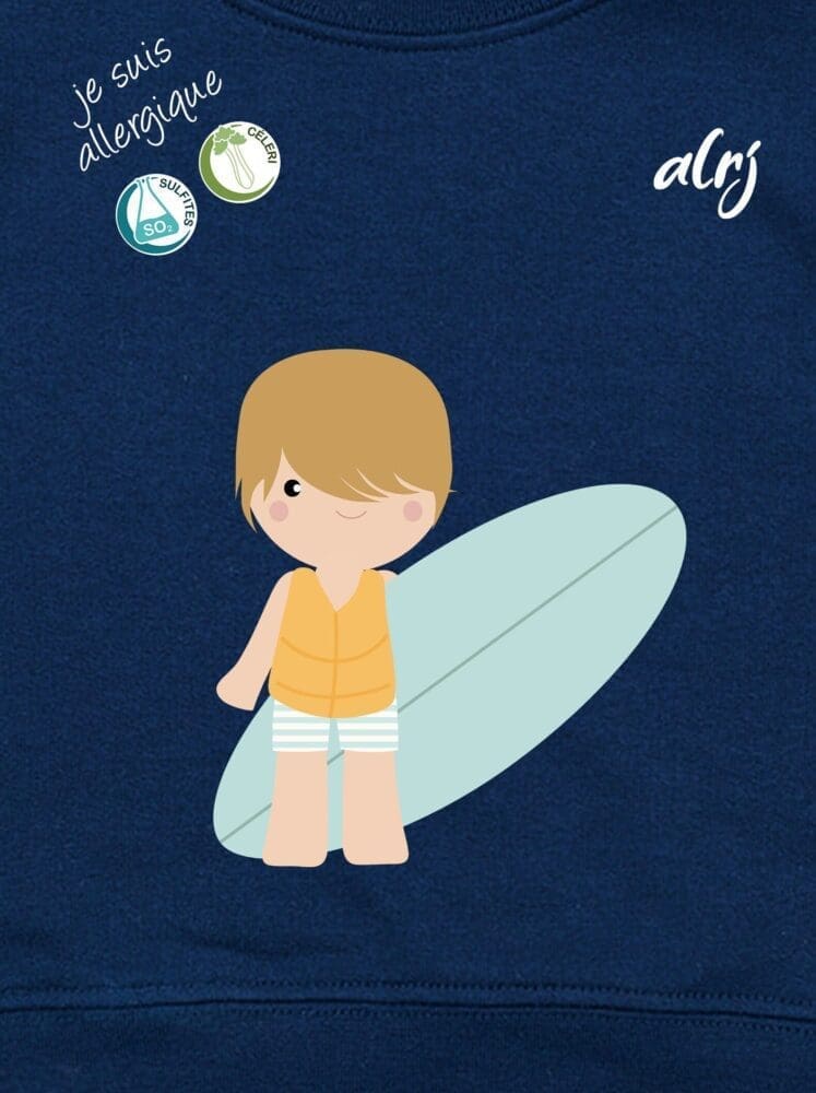 Pull 80% coton et 20% polyester avec marquage des allergies alimentaires et motif Surfeur.