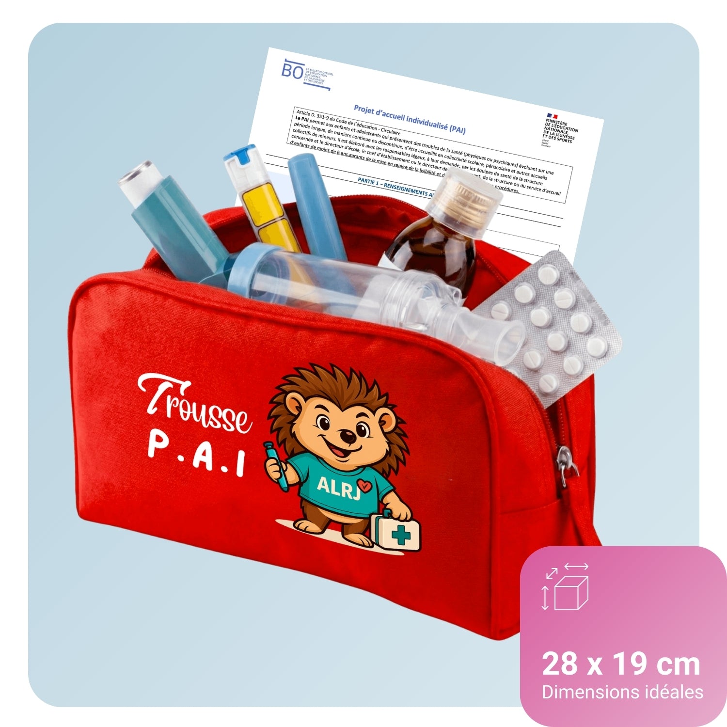 Notre trousse est spécialement dimensionnée pour contenir l'intégralité des éléments nécessaires au Projet d'Accueil Individualisé de votre enfant.