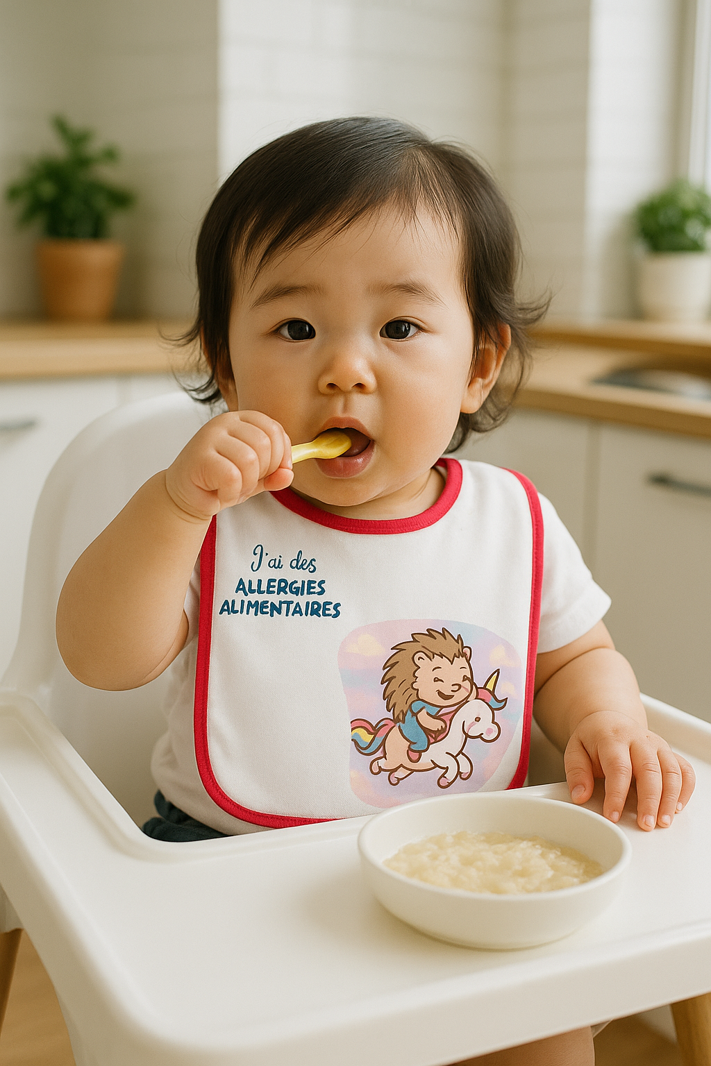 Découvrez notre collection de bavoirs bébé allergies alimentaires et offrez à votre enfant une protection visible et rassurante dès ses premiers repas.