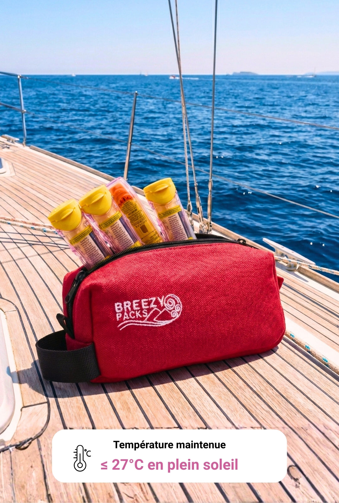Contrairement aux trousses classiques avec des packs de glace (qui fondent !), la Breezy utilise un changement de phase physique qui maintient automatiquement vos médicaments sous 27°C.