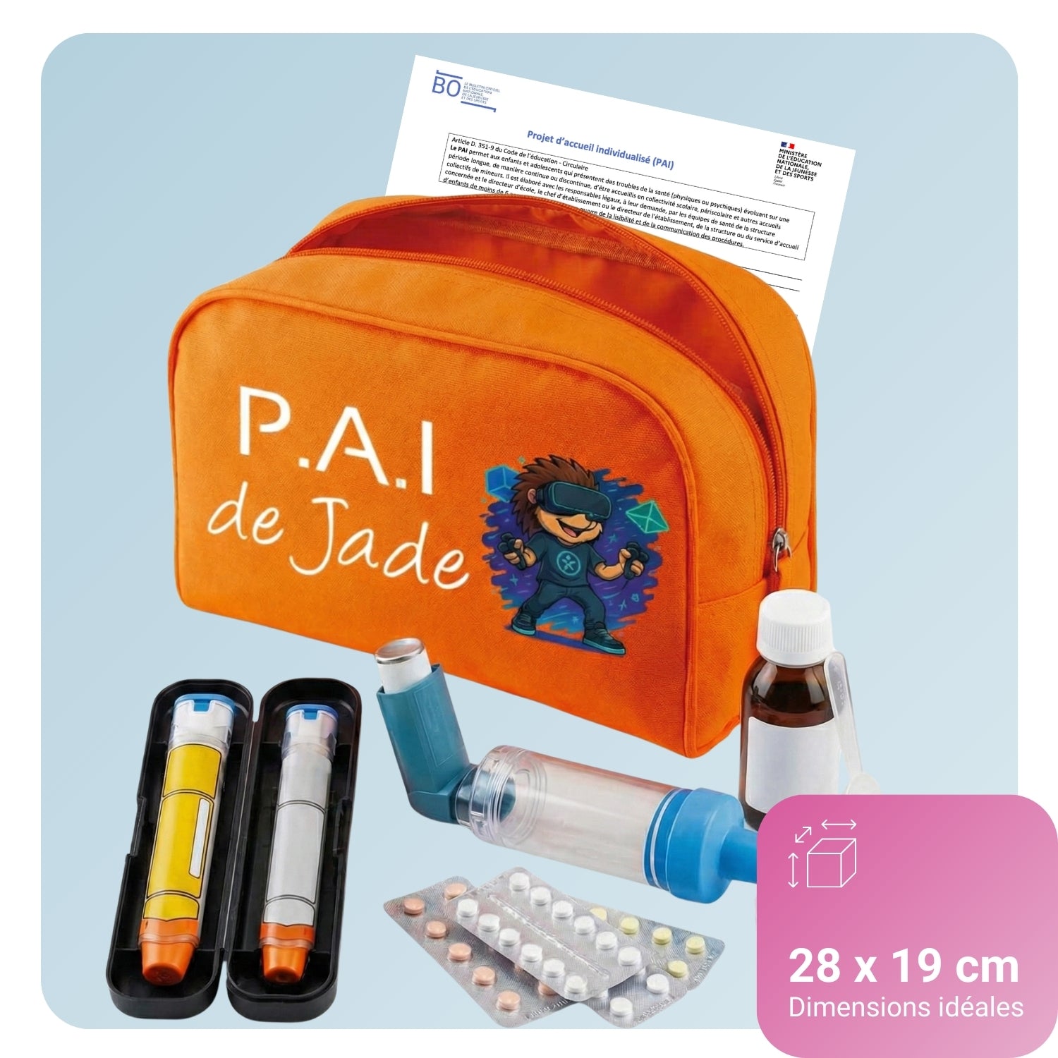 Notre trousse est spécialement dimensionnée pour contenir l'intégralité des éléments nécessaires au Projet d'Accueil Individualisé de votre enfant.