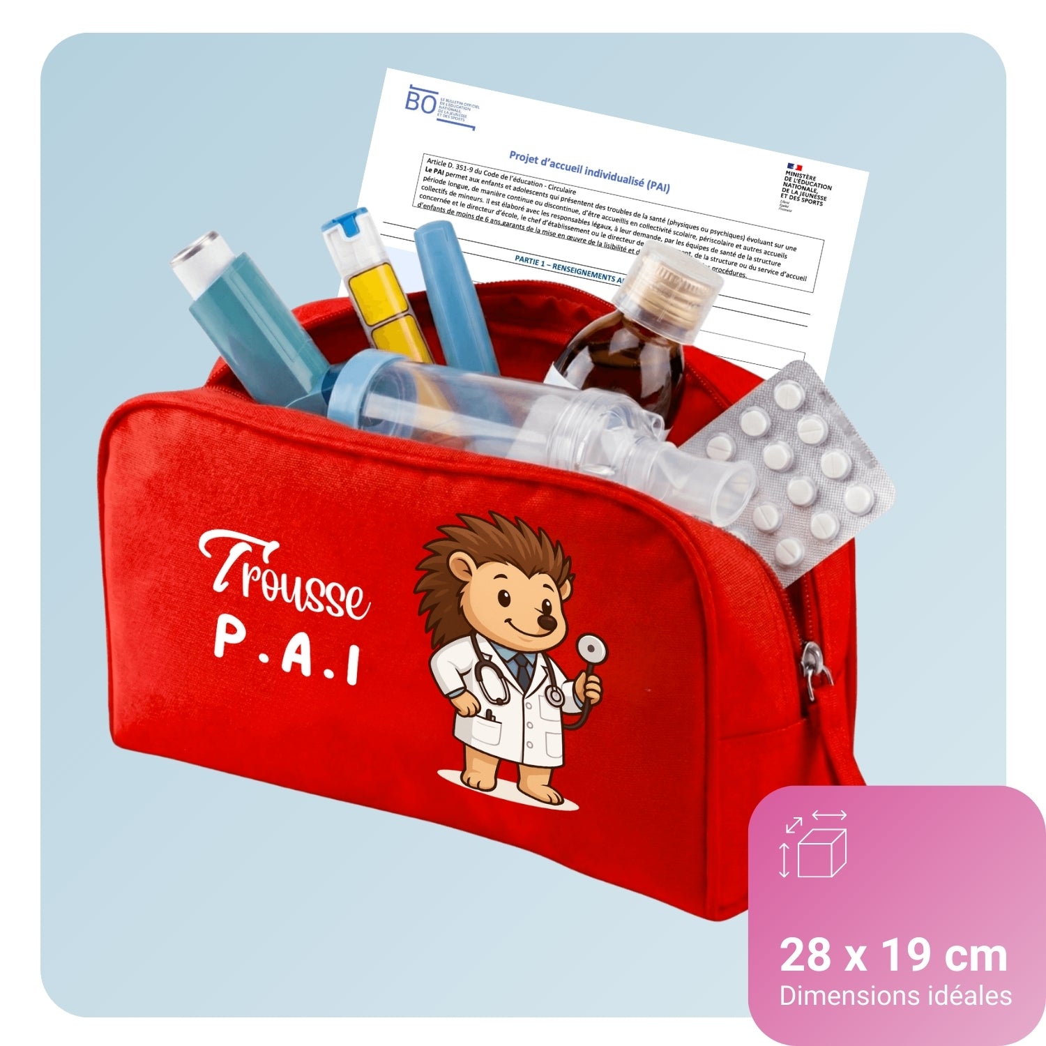 Notre trousse est spécialement dimensionnée pour contenir l'intégralité des éléments nécessaires au Projet d'Accueil Individualisé de votre enfant.